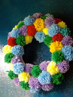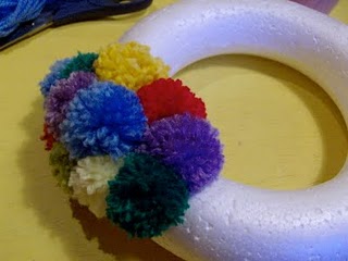 Esta guirlanda é boa para nos ajudar a fazer uma faxina de fim de ano nos fios e lãs, riss. Feita com sobras de fios. Se vc não achar a base de isopor, pode usar de capim, bem comum nas lojas de artesanatos, ou um circulo de papelão, tudo é válido uma vez que será recoberto pelos pompons.